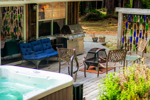 Relax beneath the canopy of trees in your private hot tub. Soak, stargaze, and let the quiet of the forest wash over you.